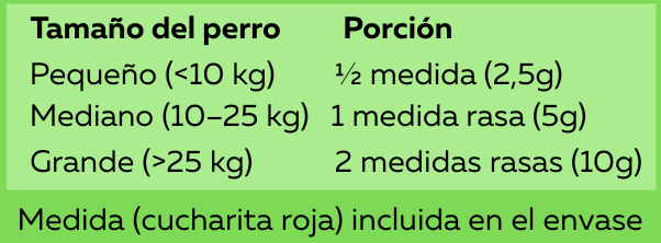 Se disuelve fácilmente en pocos mililitros de agua tibia y puede rociarse sobre el alimento, integrándose de manera simple a la rutina diaria de tu perro.